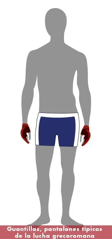 Los pantalones son los típicos de la lucha grecoromana, cortos y ajustados tipo calzoncillo.