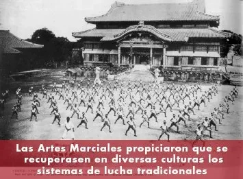 historicas como una reinterpretación, propició que se recuperasen en diversas culturas los sistemas de lucha tradicionales. Así, en Japón se diferencian las antiguas tradiciones o escuelas (koryu o más bien ryu ha) en relación a las artes surgidas tras la restauración Meiji (gendai) y en China las artes marciales tradicionales (kuo shu) del wushu moderno.
