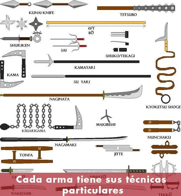 incluyen: •El arco •La lanza •La espada •El bastón y existen múltiples armas secundarias como cadenas, mazas, hachas, cuchillos,... Cada arma tiene unas técnicas particulares. La técnicas desarrolladas en los sistemas sin armas pueden consistir en puñetazos, patadas, agarres, luxaciones, estrangulaciones ,proyecciones e inmovilizaciones, y pueden atender a la existencia o no de armadura.
