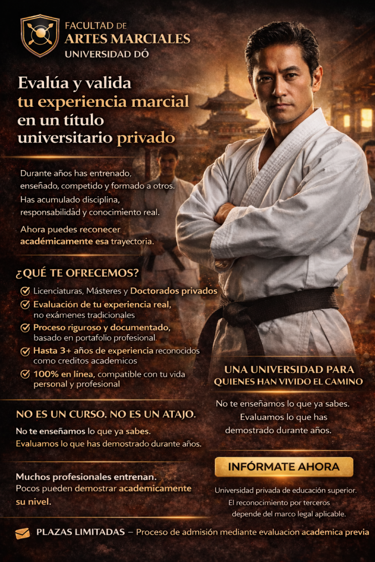 SE acredita con 8 años a licenciado + máster+ doctorado en artes marciales, deportes de contacto, defensa personal.